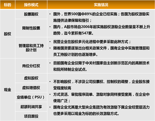 從國內(nèi)外企業(yè)實(shí)施經(jīng)驗(yàn)來看,主要分為以股權(quán)或現(xiàn)金為標(biāo)的的兩類激勵(lì)方式,常見的操作模式包括:
